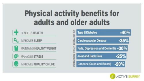 The benefits of exercise have been widely reported – we know that exercise helps keep weight down and can help you sleep. But did you know that it significantly reduces the risk of falls and reduces the risk of developing dementia by 30%? The table below shows some of the health benefits of physical activity.