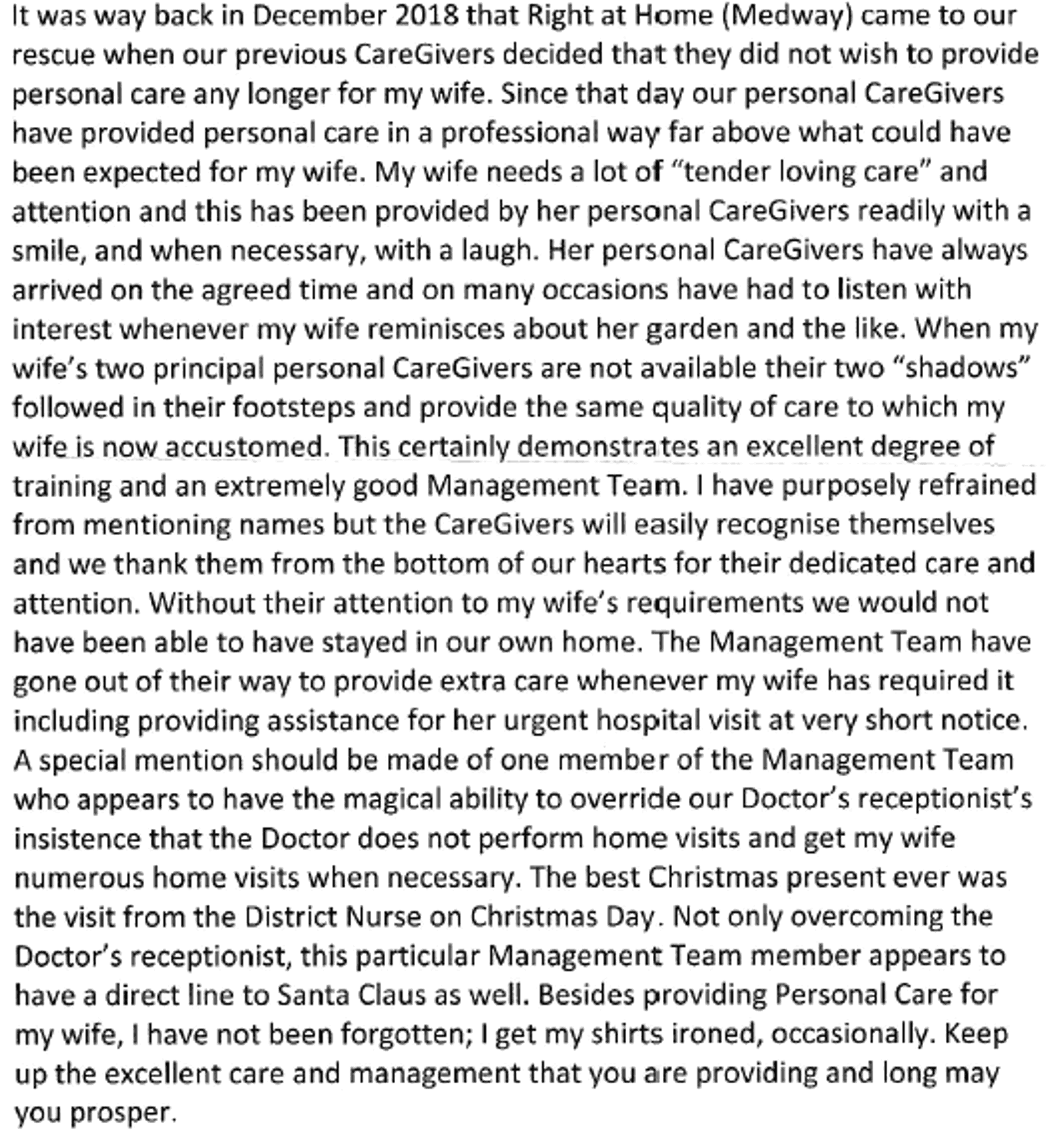 This is one of the most heart-warming reviews we have received from our Clients so far. Written by JS (Chatham) regarding the care that provide for his wife MS (Chatham). Nothing more for us to say other than Thank You JS and MS, the words in your review say it all…