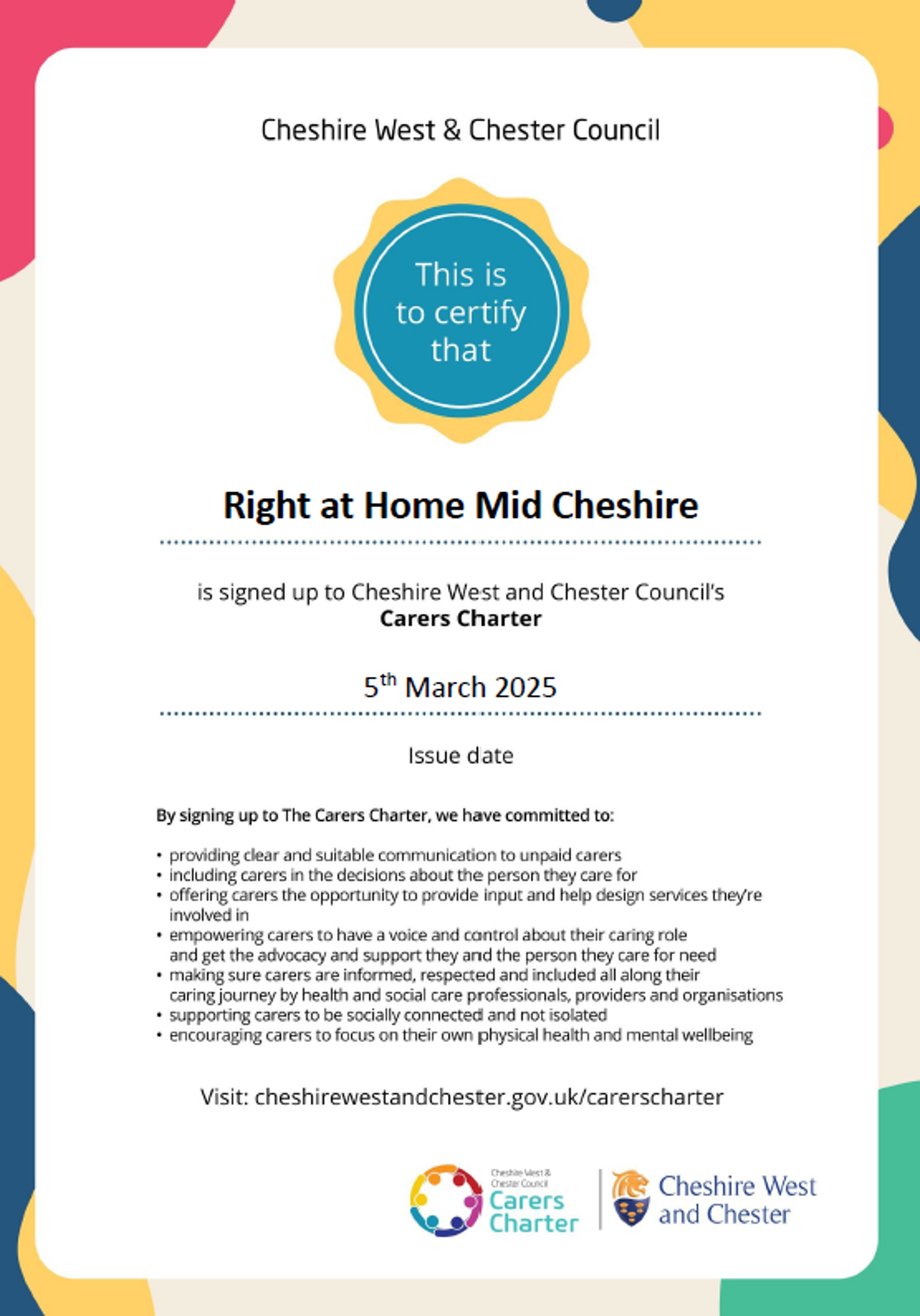 Right at Home Mid Cheshire are now Members of the Carers Charter working in association with Cheshire West & Chester Council