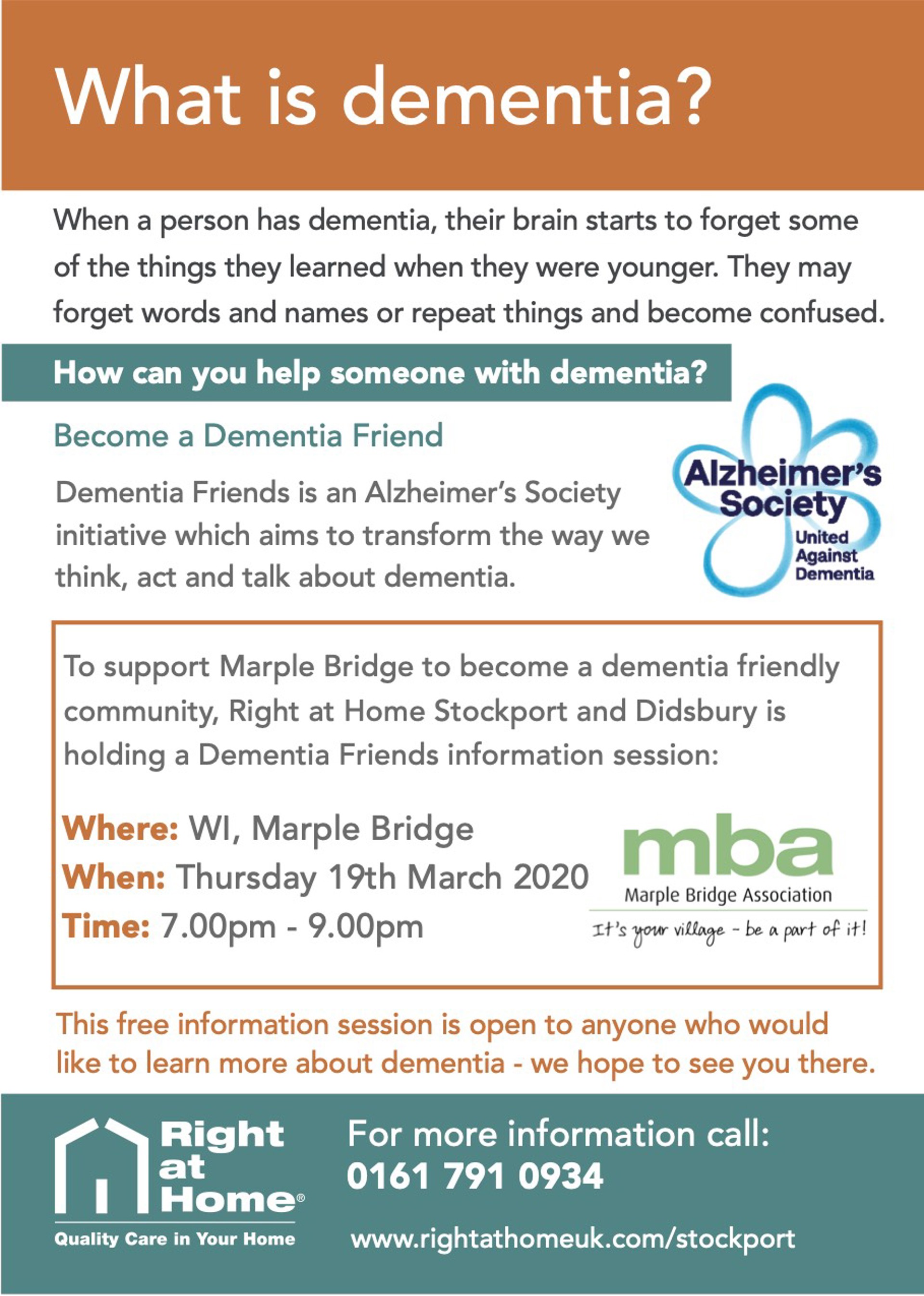 We are holding a free dementia friends session at the Women’s Institute, in Marple Bridge.